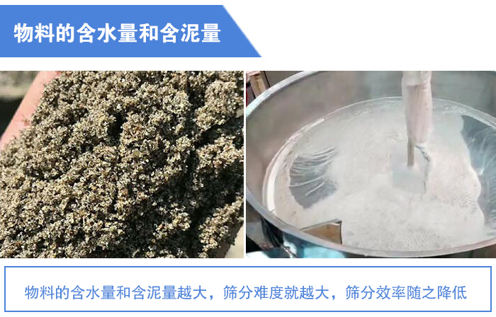 如果物料中包含的表面水分在一定程度内增加,那它的粘滞性就会增大,造成细粒互相粘结成团,并附着在大颗粒上;同时还有物料中包含的粘性物质,很容易把筛孔堵住。这些都大大降低了筛分效率。