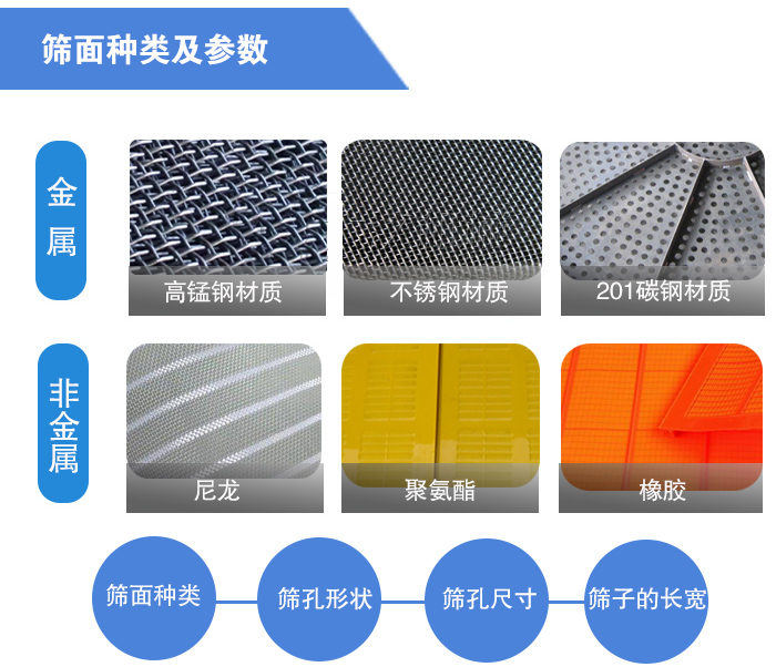 筛子的工作面通常有三种,钢棒制造的、钢丝编织的和钢板冲孔的。它们对筛分效率的影响主要和它们的有效面积有关,有效面积愈大的筛面,筛孔占的面积愈多,矿粒就更容易透过筛孔,这样筛分效率就会变高,但相对的筛面寿命会较短。因此选择筛面要根据实际情况。