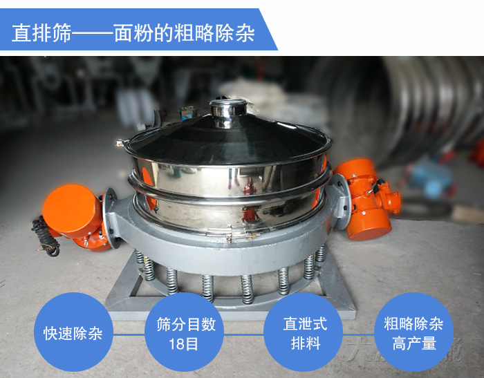 直排筛是高效的筛分设备,利用安装在筛机两侧的振动电机提供的激振力驱动面粉在筛面上做上下运动,并采用直泄式排料方式,过筛的面粉直接透过筛网在下方的排料口排出,十分符合面粉的粗略除杂和高产量要求。