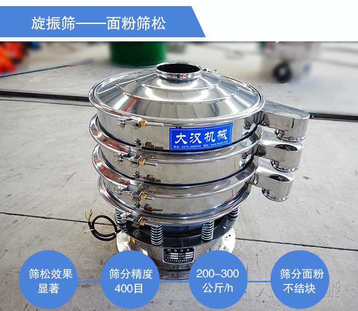 面粉在制作蓬松精制糕点时要求有足够的蓬松度,且不能有结块现象,此时就需要面粉振动筛承担面粉筛松的作用,一般要求使用40目的筛网对面粉进行筛分。