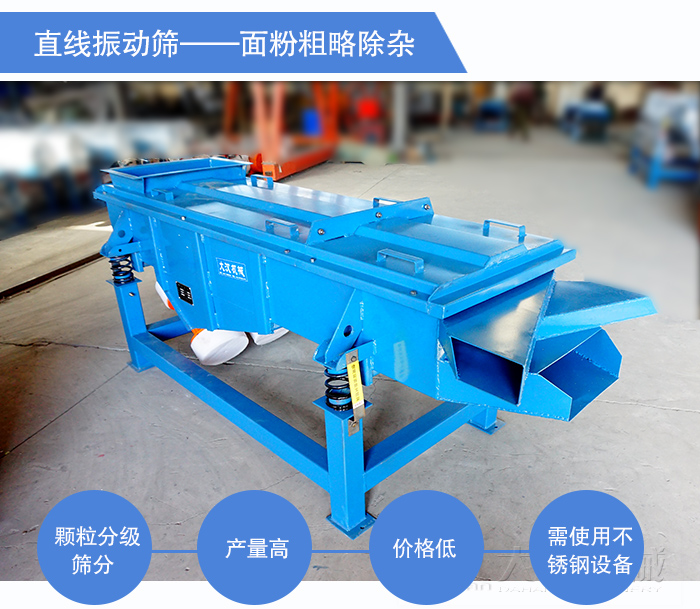 直线振动筛主要是进行颗粒分级和筛分的设备,有着产量高、筛分效率高的显著优势,但是筛分精细度不及旋振筛。面粉厂用直线振动筛一般也不做高精度的筛分之用,而是和直排筛一样,用来处理类似于合格证、线头等的较大的杂质,筛分产量基本和同型号的直排筛相差不大,但是其造价却远远低于直排筛,因此比较喜欢低价格的客户常常会用倾向于用直线式面粉振动筛来取代直排筛,但是需要注意的是此时的直线筛筛机必须使用不锈钢制作,以满足食品行业的卫生要求。